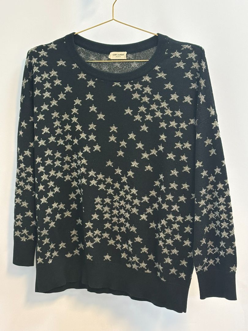Saint Laurent star sweater, YSL star knit, Hedi Slimane Saint Laurent, metallic star sweater, designer black wool sweater, luxury Saint Laurent resale, glam rock knitwear, Saint Laurent silver star pullover