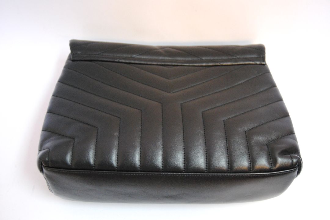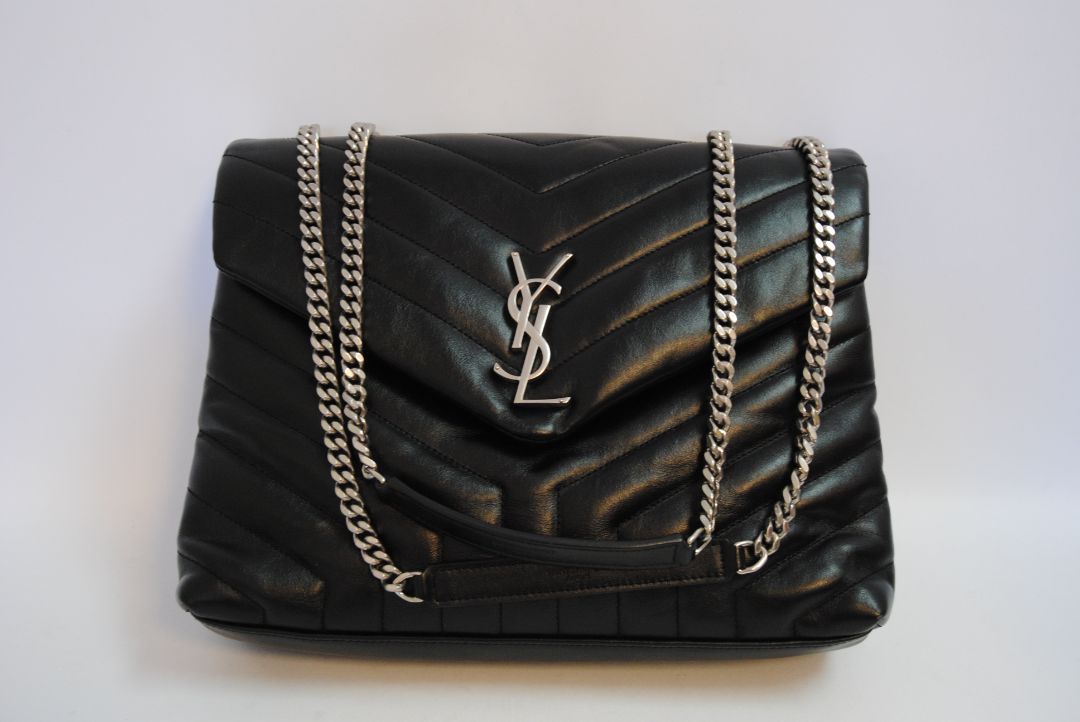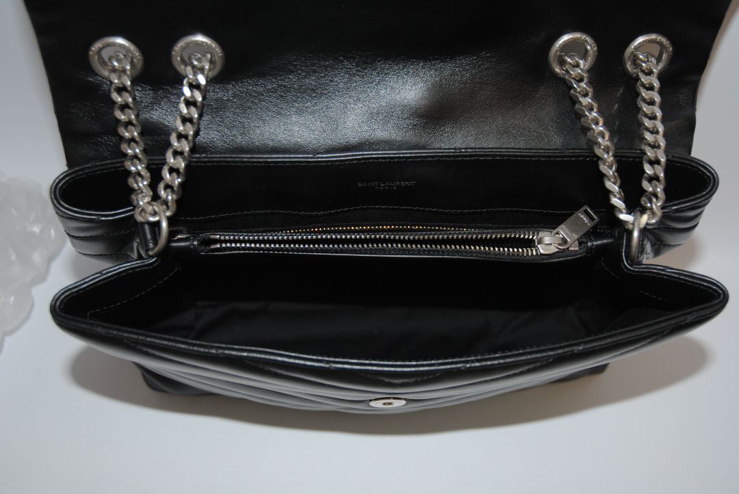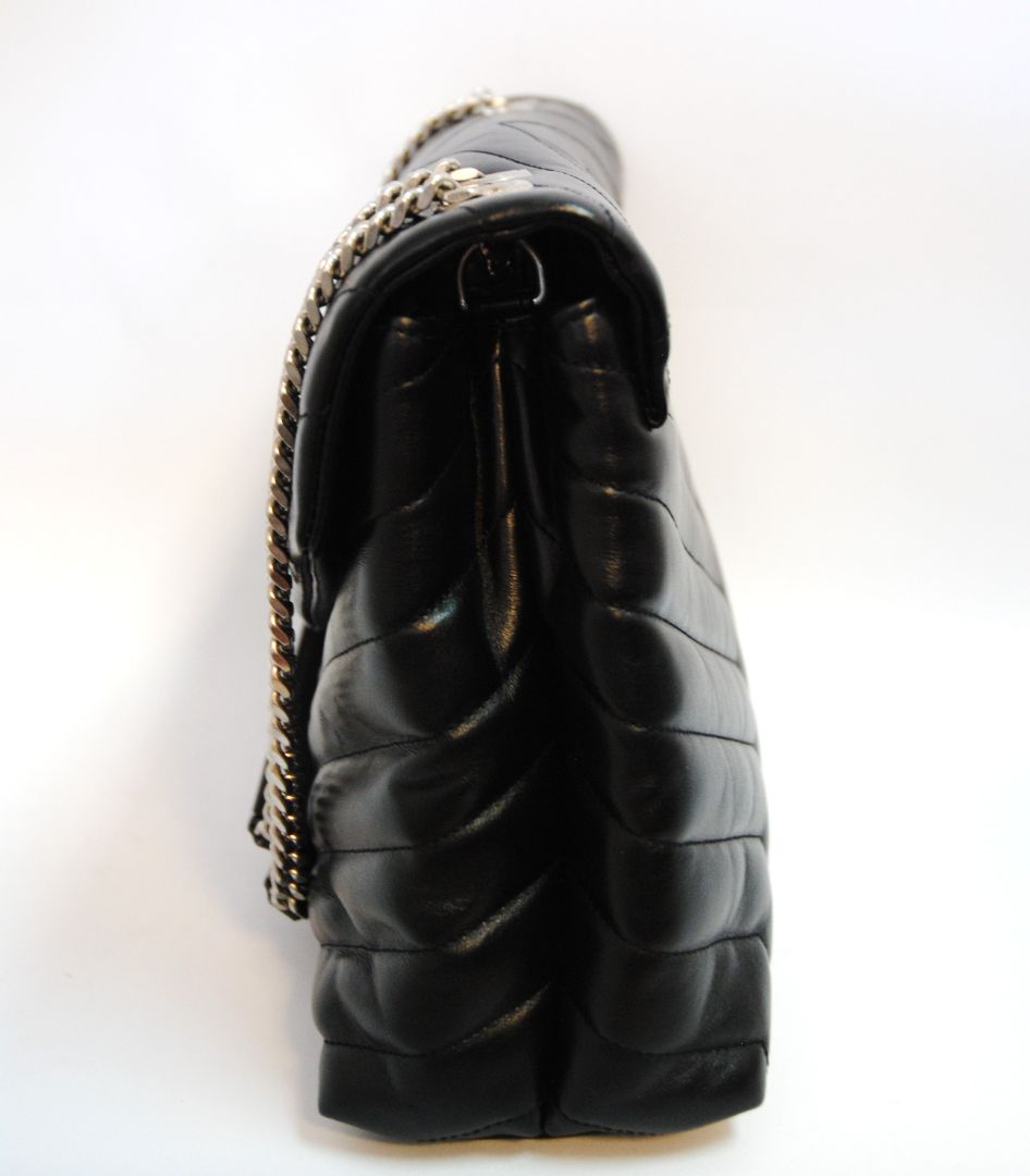 black and silver Saint Laurent loulou large calfskin, Length: 14 in (35.5 cm) Height: 10 in (25.5 cm) Depth: 5.1 in (13 cm) Strap Drop (Double Chain): ~11 in Strap Drop (Single Crossbody): ~19 in
