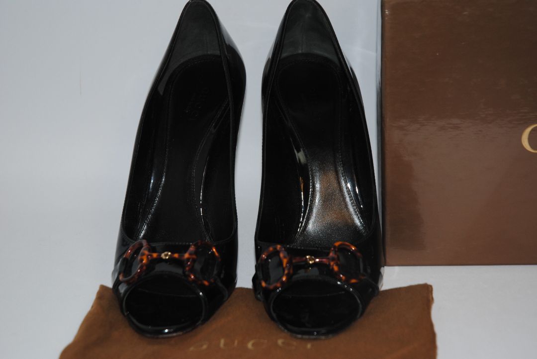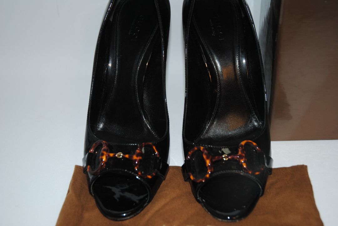 - Title Tag: Gucci Black Patent Peep-Toe Heels | Tortoise Horsebit Designer Shoes