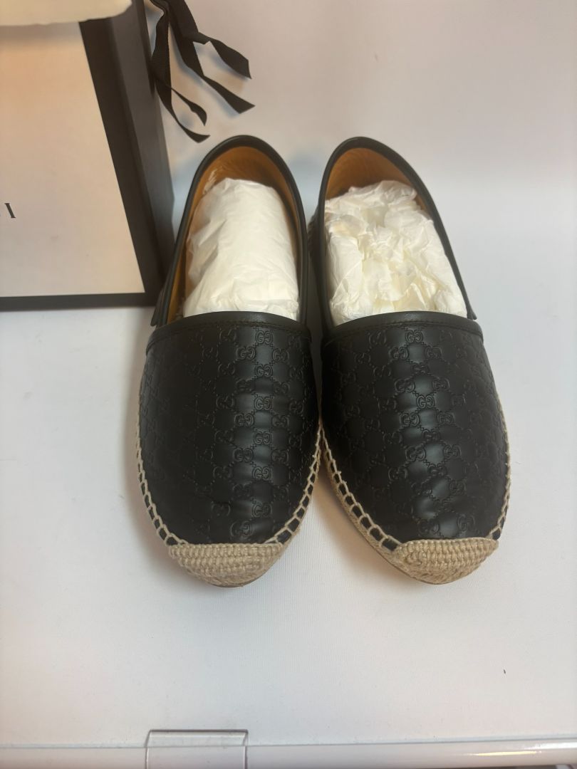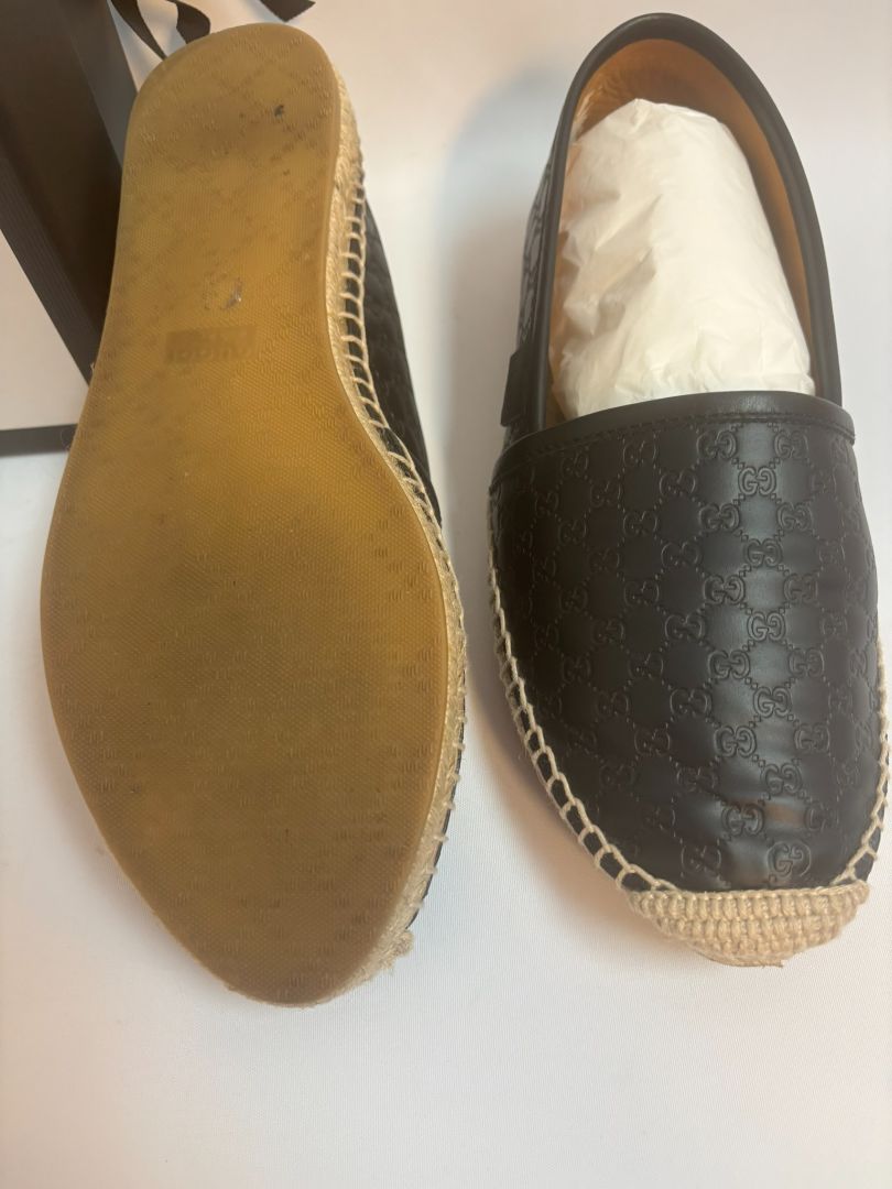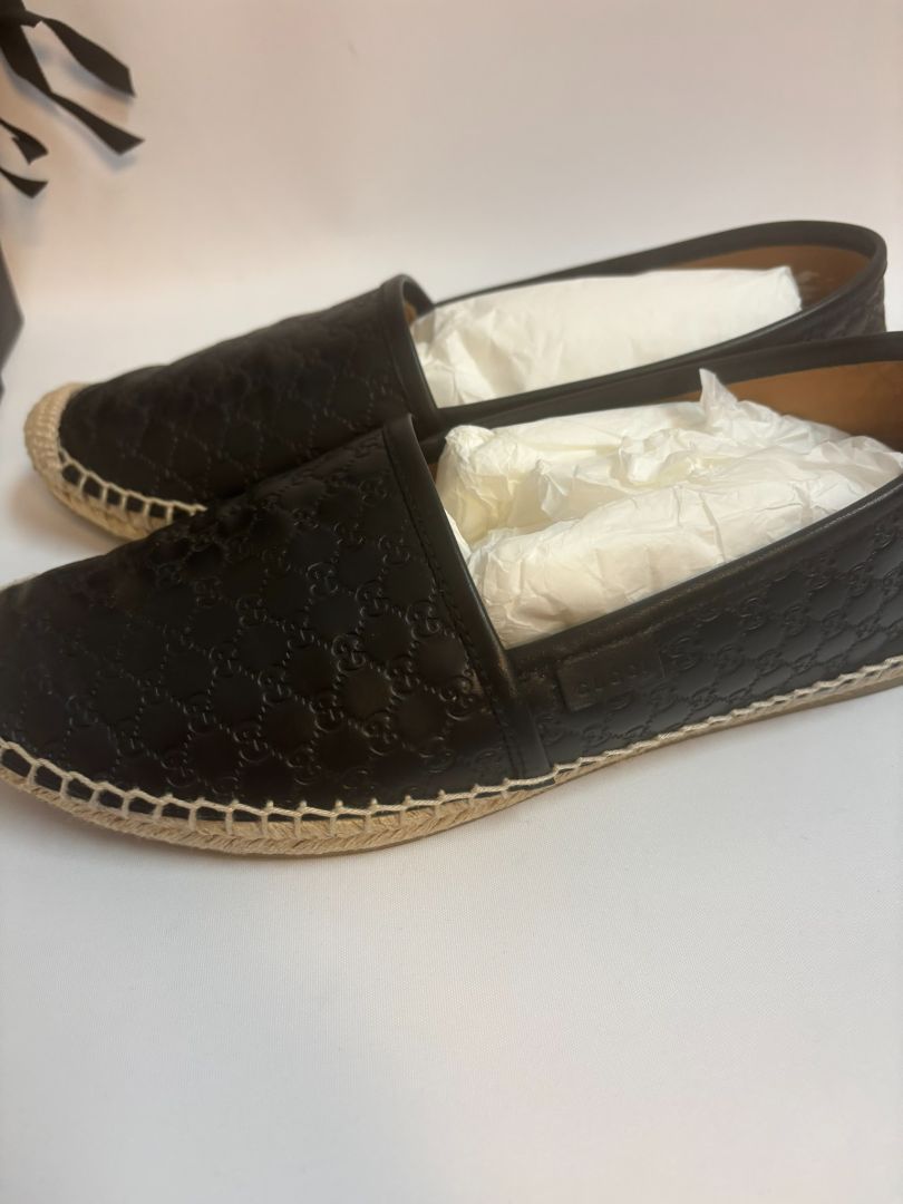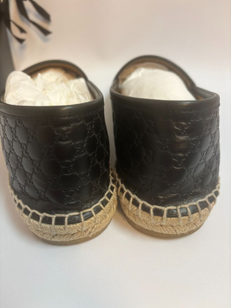 black Gucci matelese shoes, Length: 10 in Heel Height: 0.6 in (flat jute sole) Width: 3.5 in Style Fit: Slip-on, structured