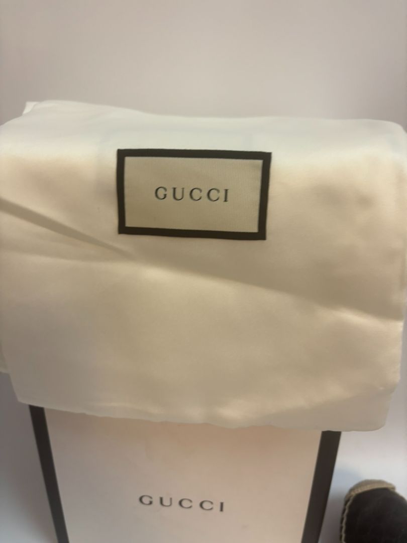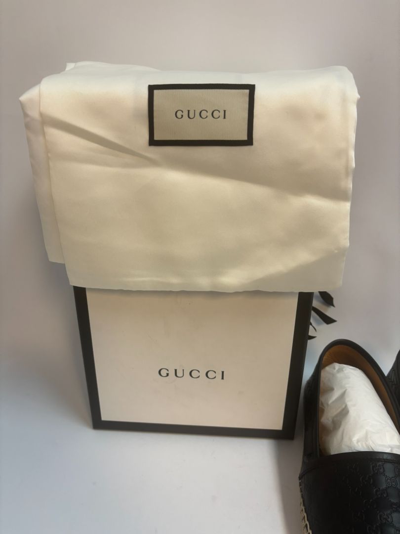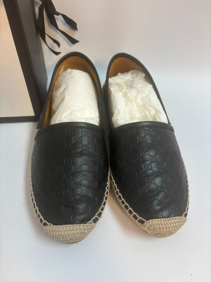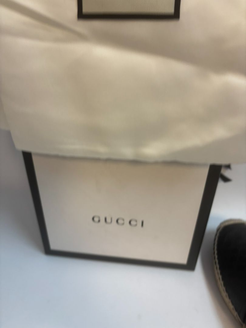 black Gucci matelese shoes, Length: 10 in Heel Height: 0.6 in (flat jute sole) Width: 3.5 in Style Fit: Slip-on, structured