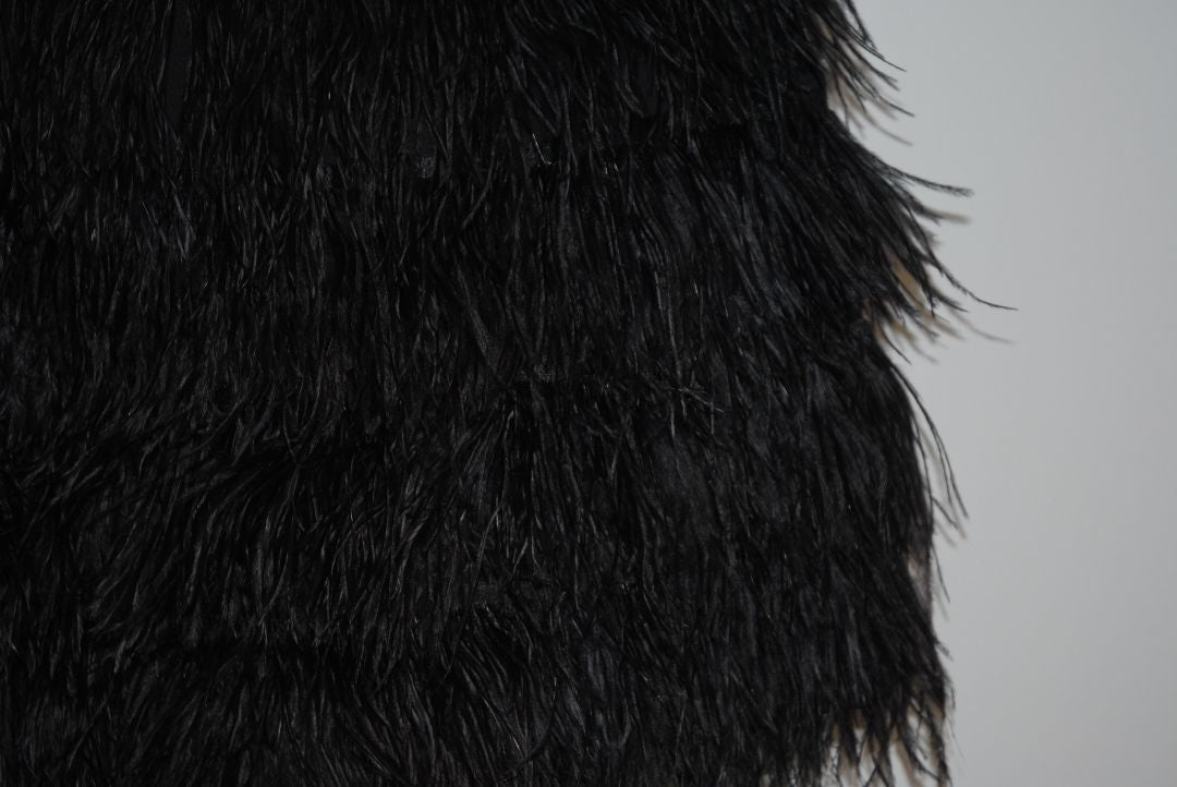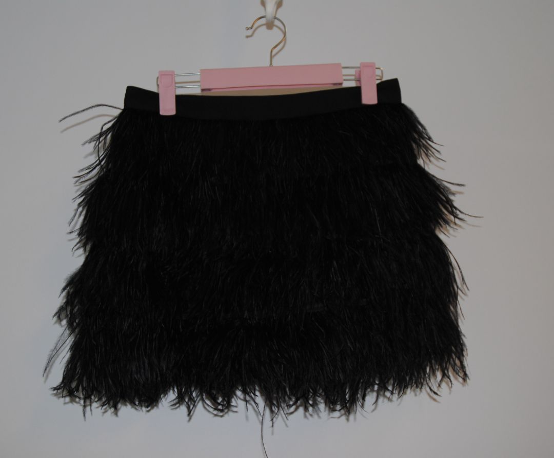 Make a glam entrance in the Juicy Couture Luxe Noir Feathered Mini Skirt. Featuring black feather fringe and a stretch waistband. Perfect for night outs and fashion statements!
