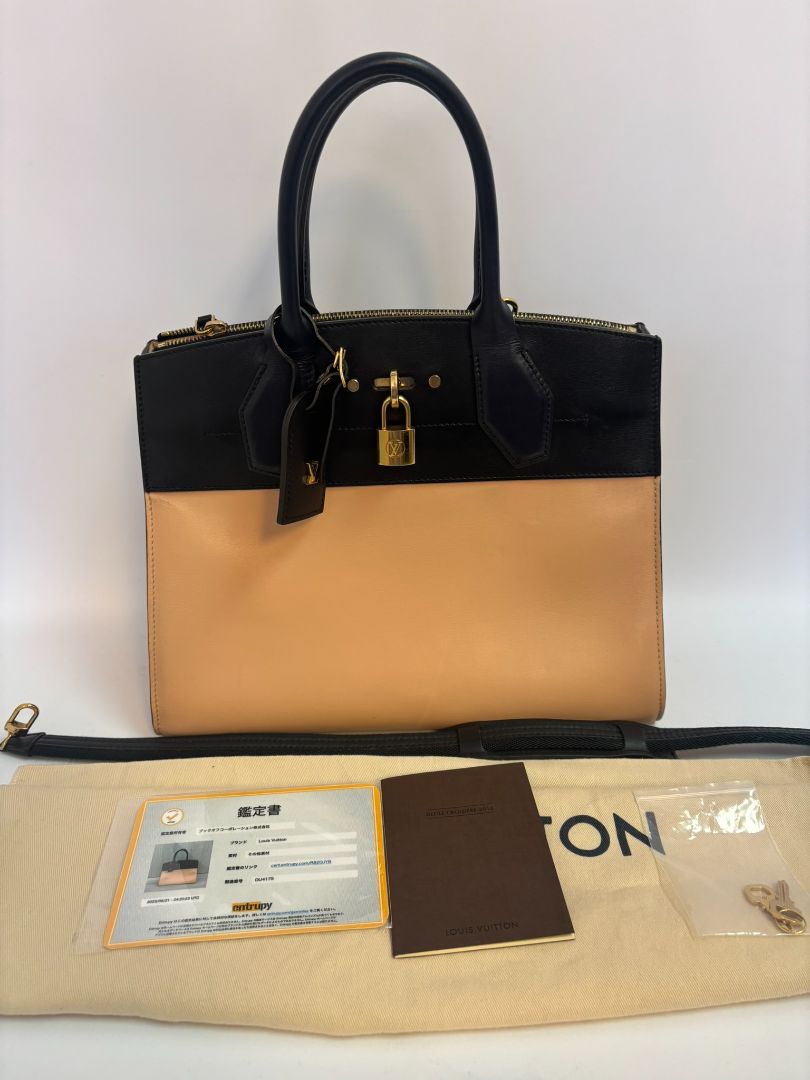 - Title: Louis Vuitton City Steamer MM – Black & Rose Ballerine Calfskin Tote