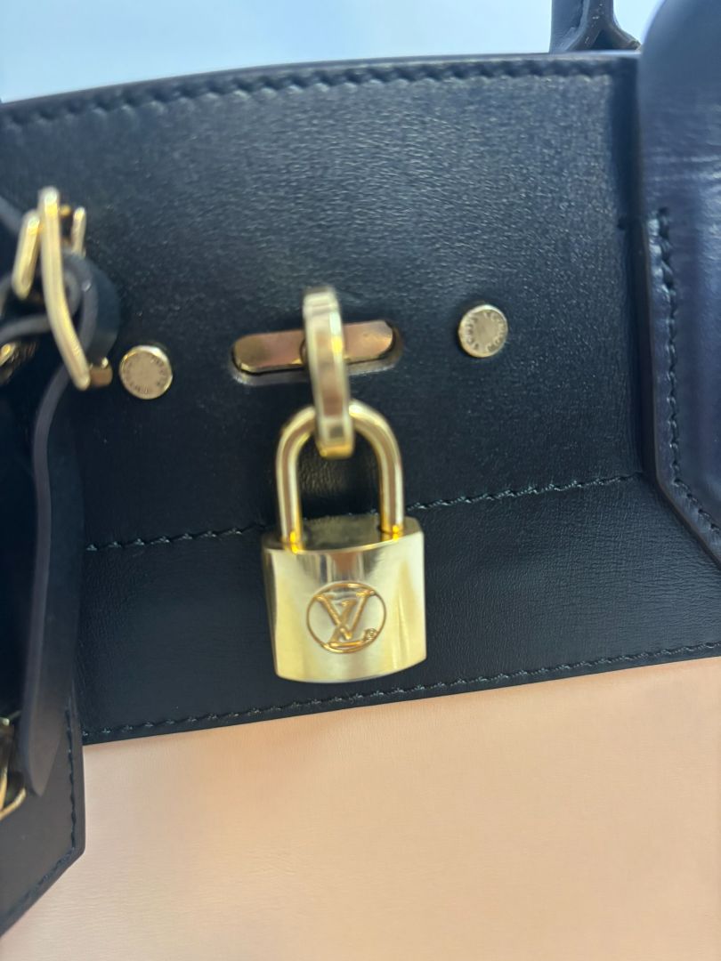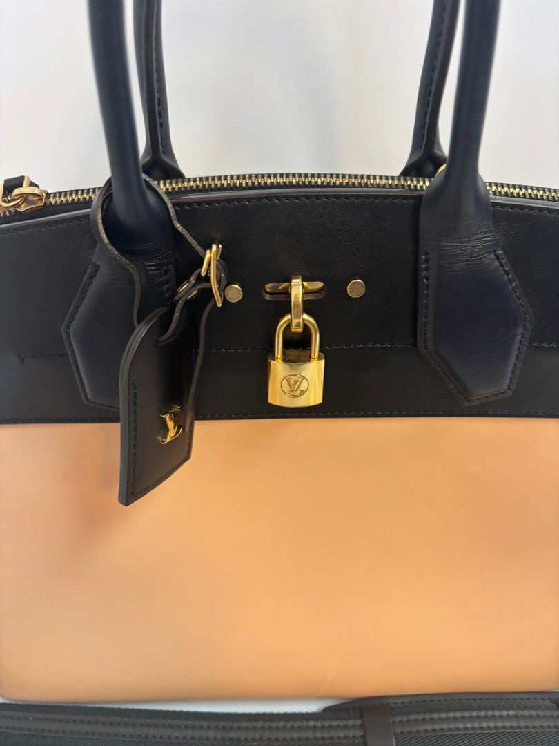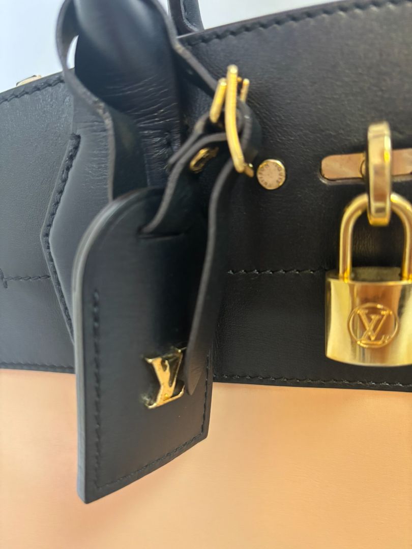 - Alt Text (for image): Louis Vuitton City Steamer MM in Black and Rose Ballerine with gold padlock and colorblock leather