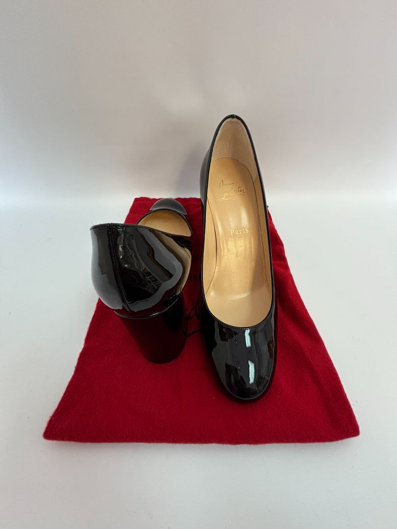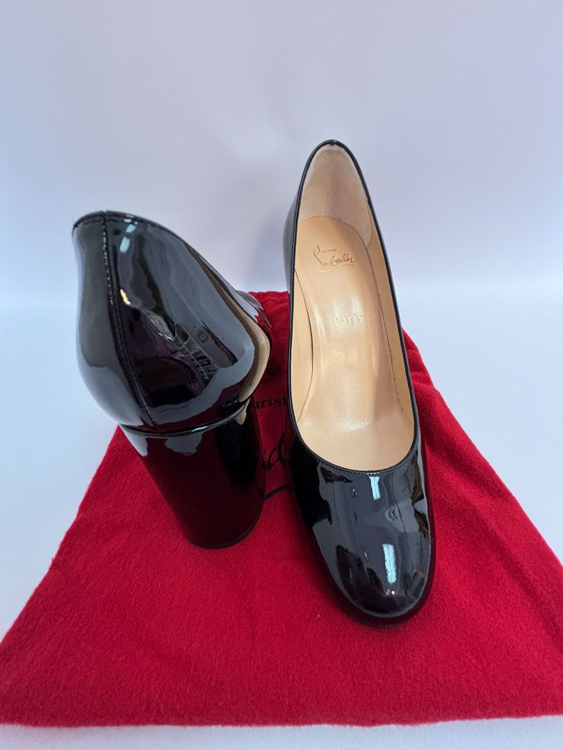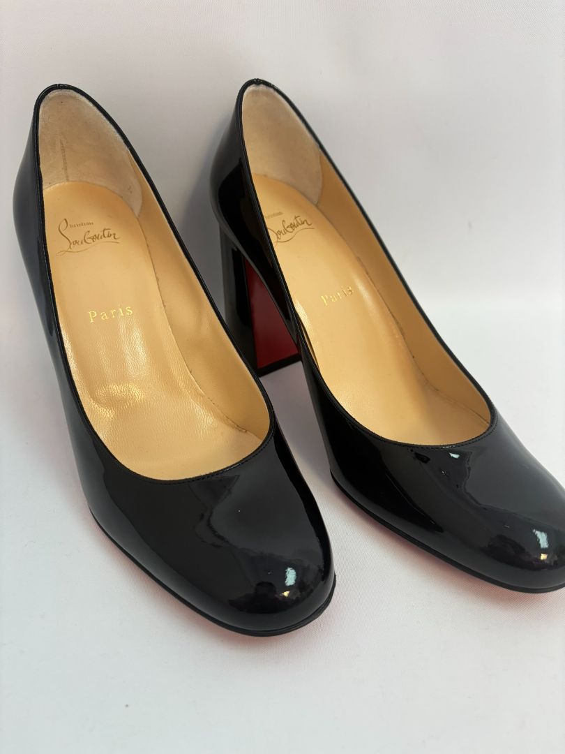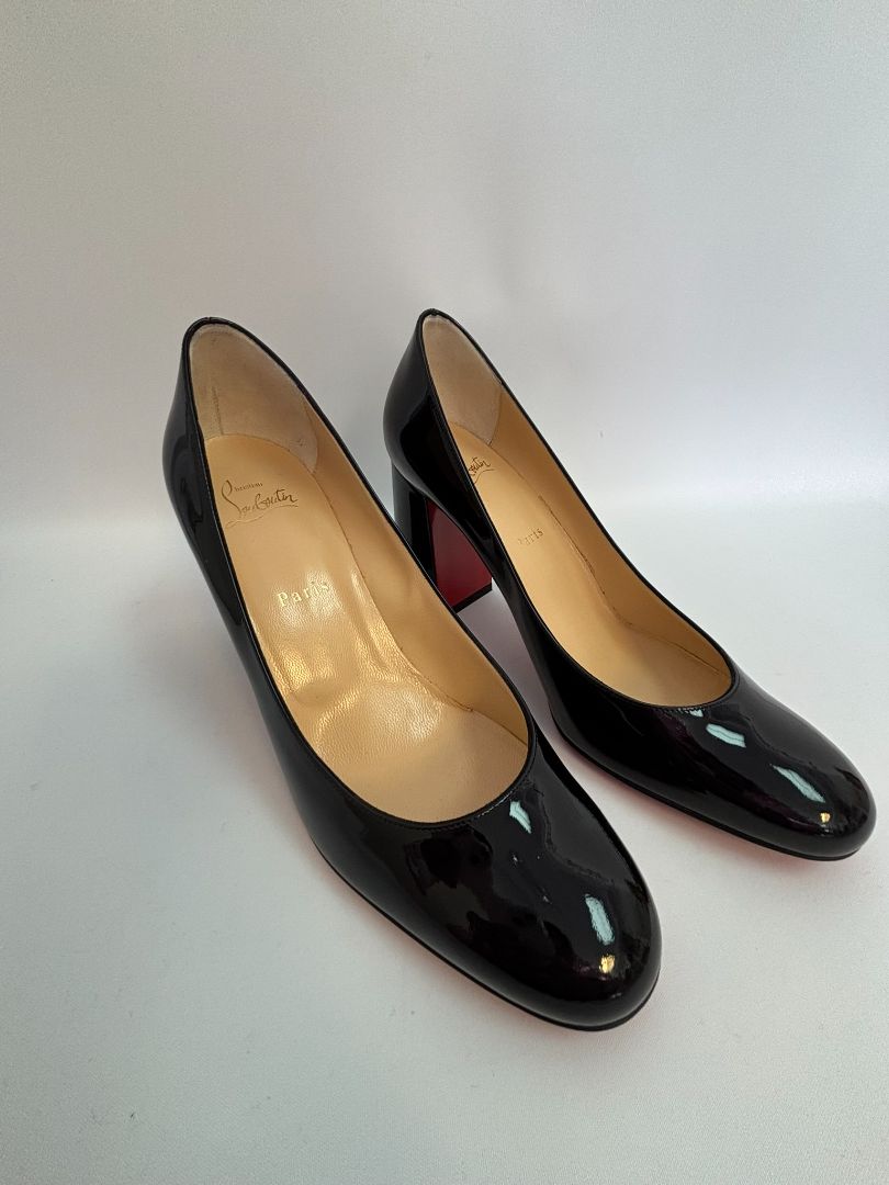 Miss Sab in patent leather, classic red bottoms, 3 inch stacked heels, round toe, perfect for a night out or casual business meeting