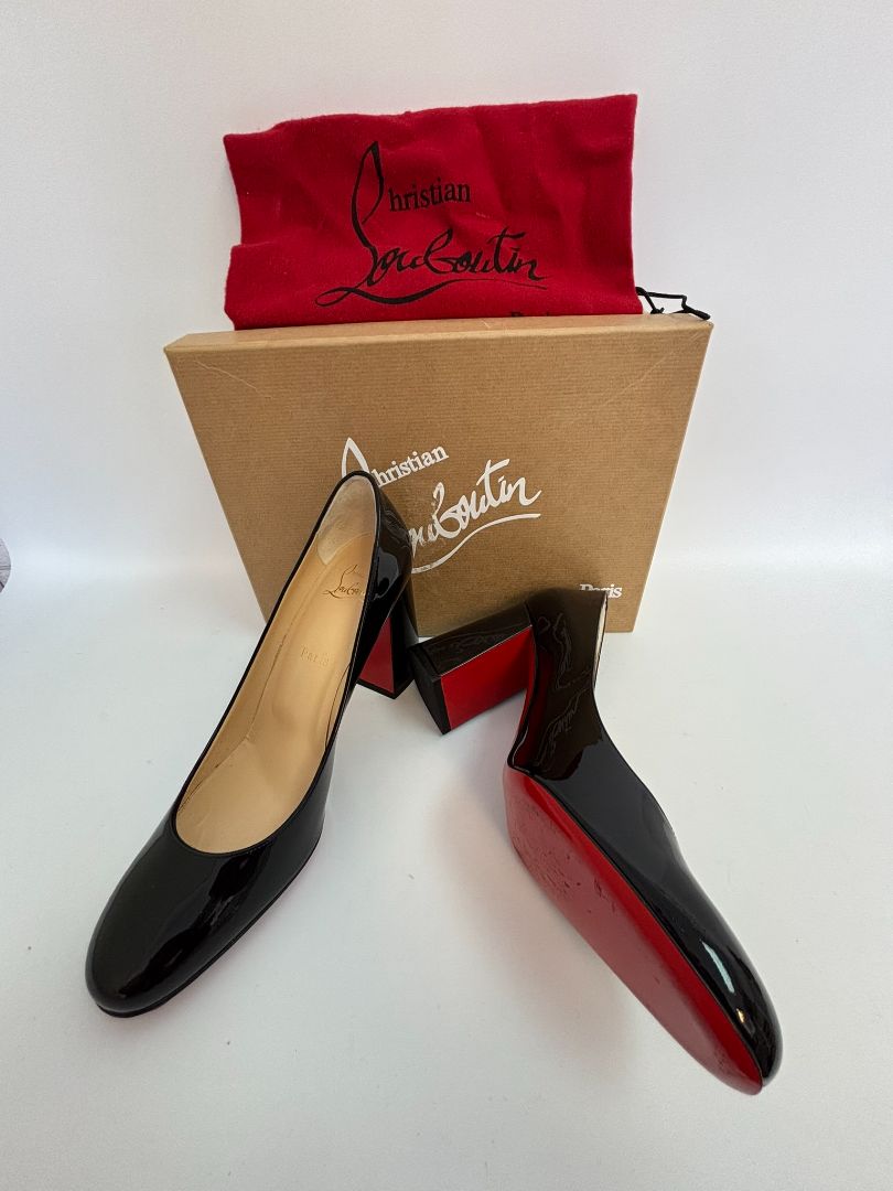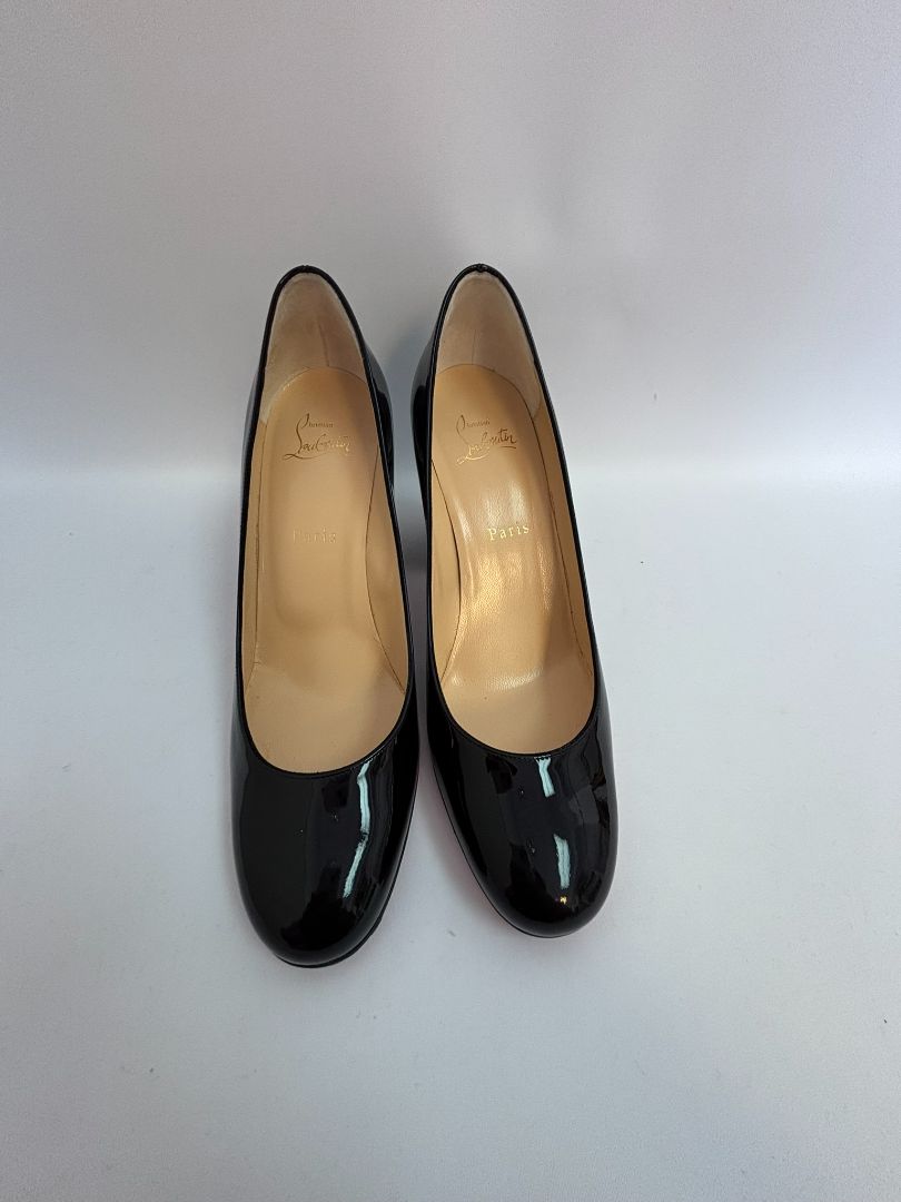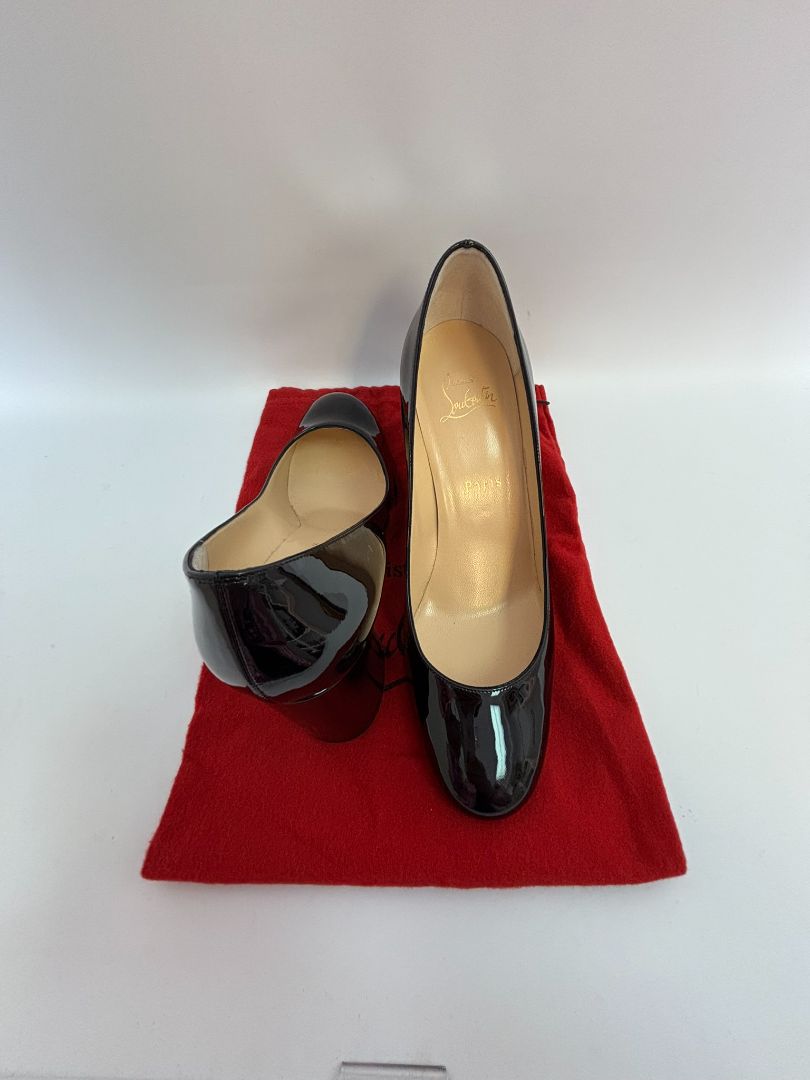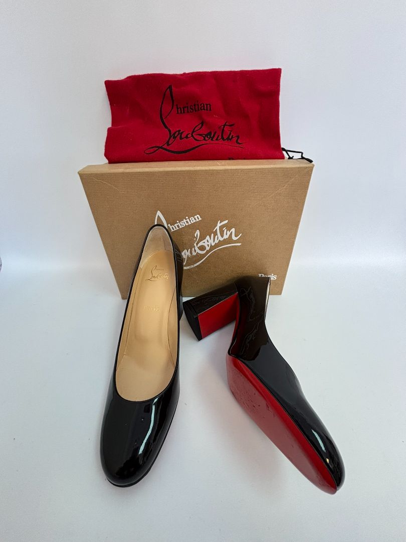 Miss Sab in patent leather, classic red bottoms, 3 inch stacked heels, round toe, perfect for a night out or casual business meeting