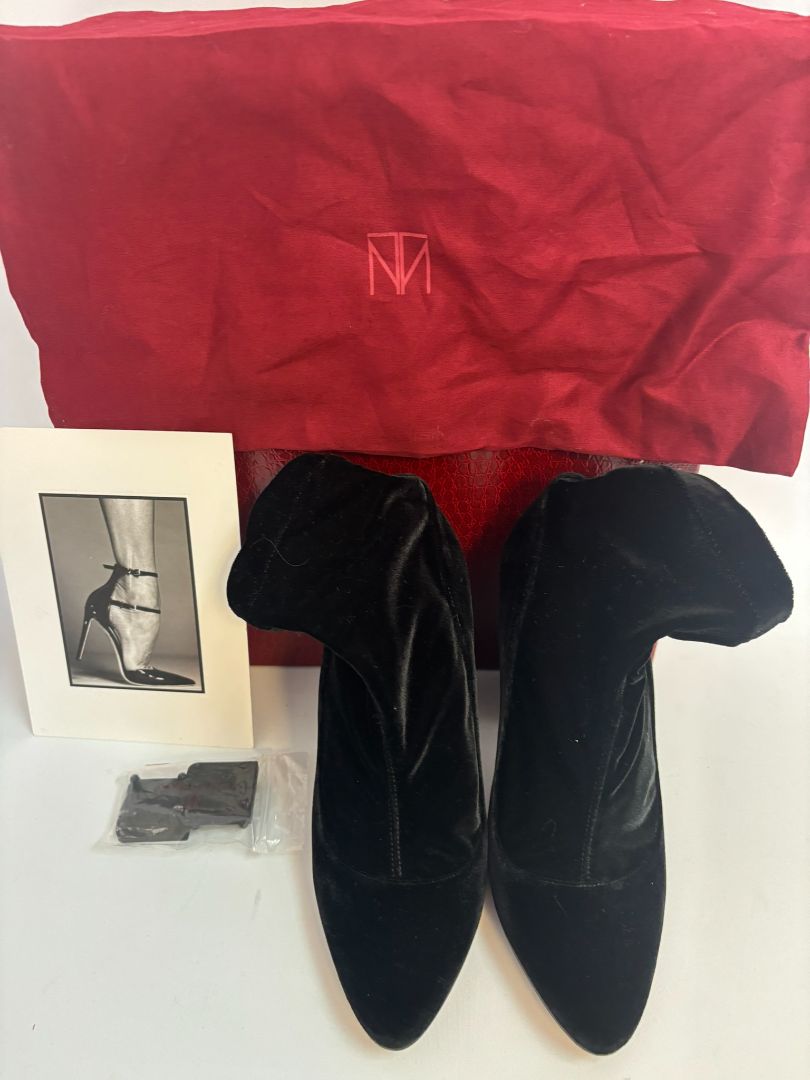 black Tamara Mellon velvet ankle boots, 36 EU Heel Height: 4.25 in (11 cm) Boot Shaft Height: 7 in Toe Shape: Pointed Footbed Length: ~10.5 in