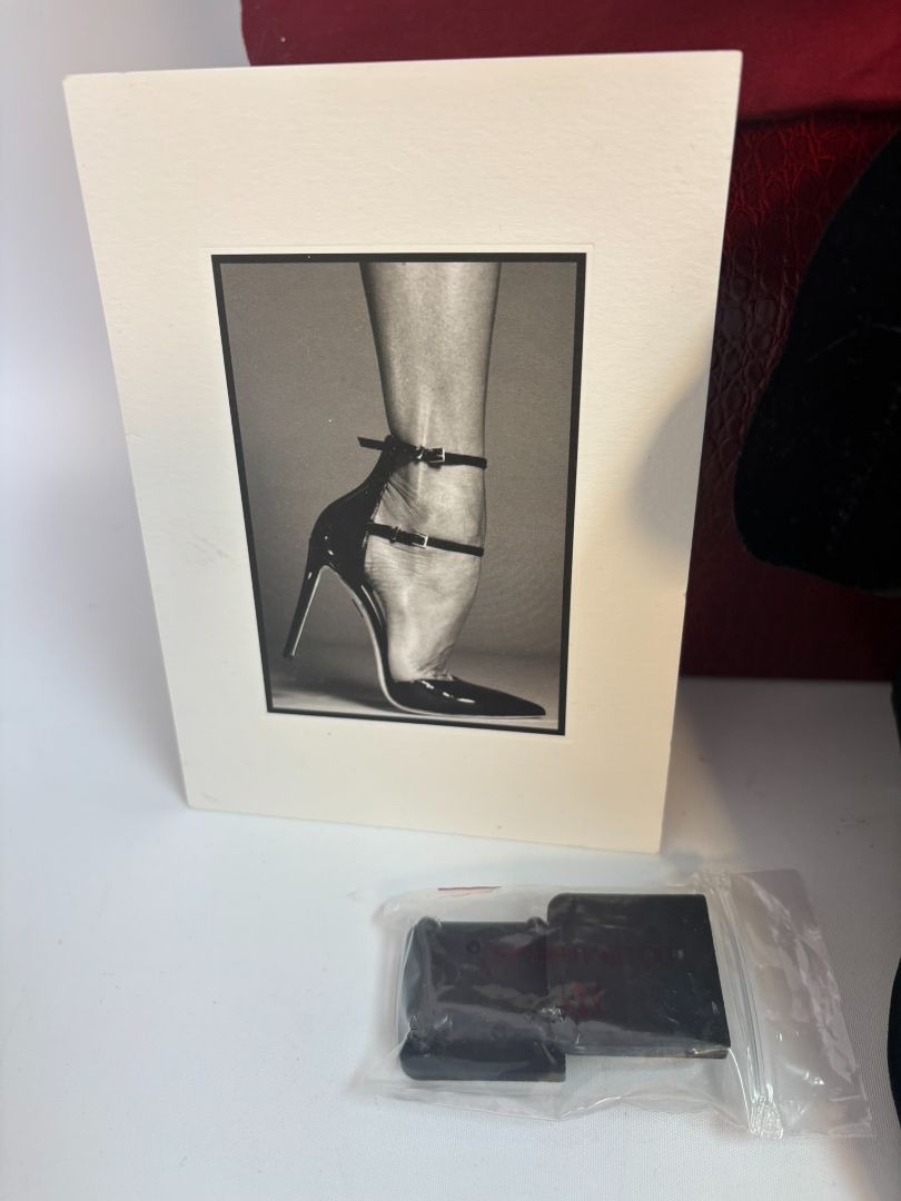 Velvet, elevated. These Tamara Mellon black velvet booties are fierce, feminine, and totally unforgettable. With a sleek pointed toe, sky-high stiletto, and signature gold-tone detail, they’re your power shoe for gallery openings, rooftop cocktails, and winter nights worth remembering.