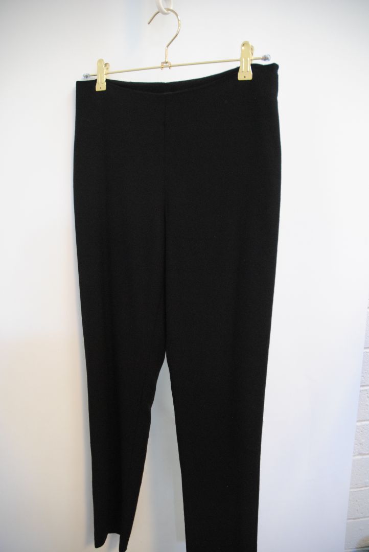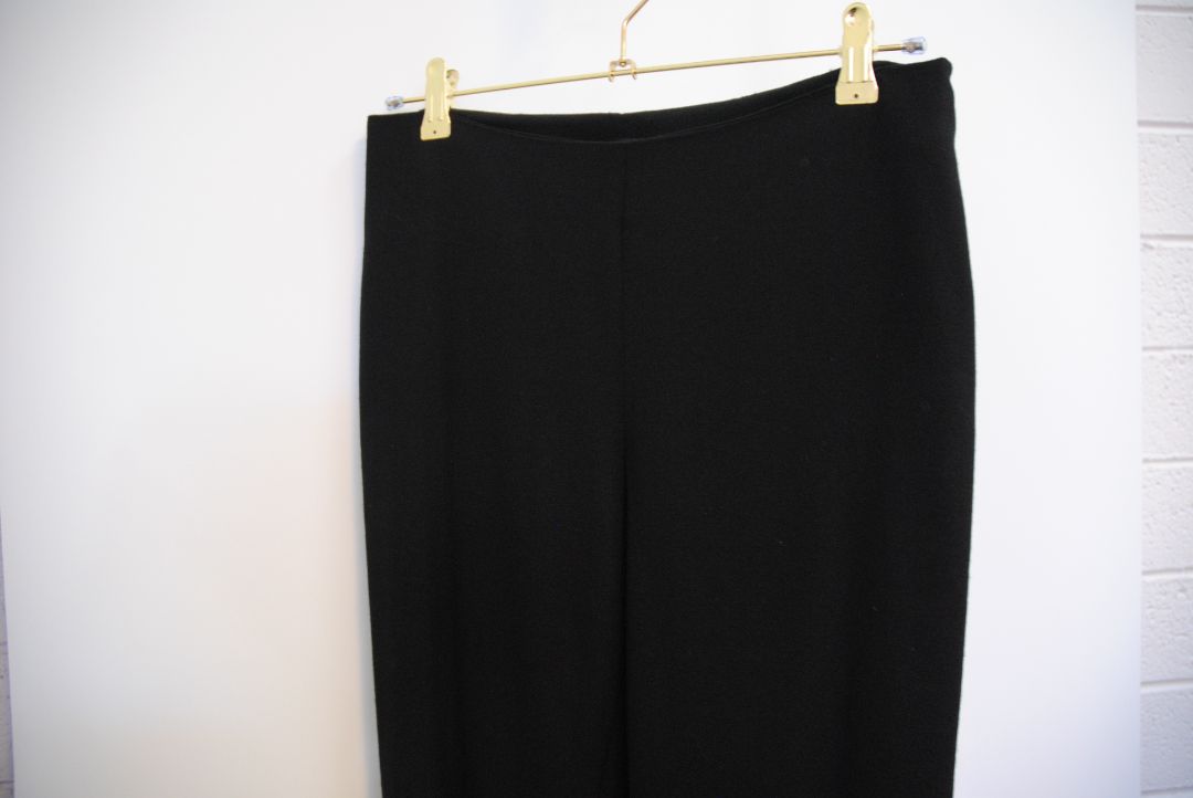 black The Row stretch knit pants, Waist (flat, unstretched): 13 in Rise: 11 in Inseam: 30 in Hip: 17 in Leg Opening: 7 in Fit: Slim leg, tapered Material: Midweight stretch knit (likely viscose-blend)