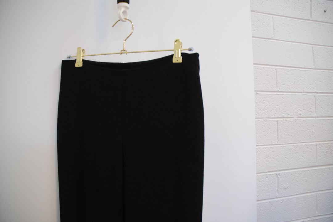 The Row black knit pants, minimalist designer pants, The Row slim pants, quiet luxury trousers, stretch knit pull-on pants, The Row resale, elevated basics, The Row essentials