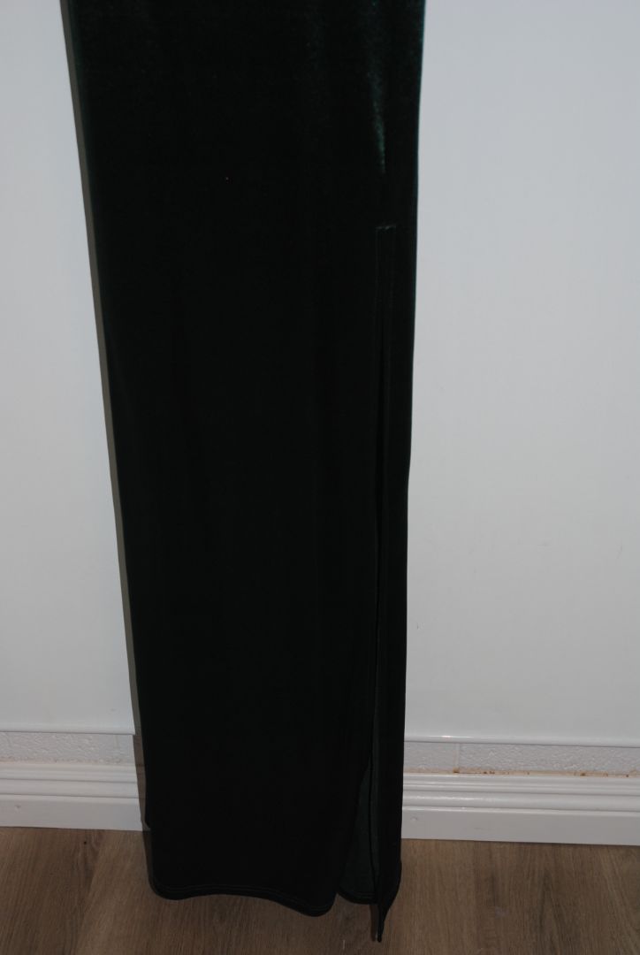 “Command the room in this luminous emerald satin gown. With its sculpted bustier top, sweeping floor-length skirt and subtle train, this piece is where red-carpet glamour meets modern sophistication. The wide straps offer stability while the boned bodice enhances your silhouette—capturing attention without saying a word. Whether you’re stepping into a gala, cocktail event or an ultra-chic soirée, this gown promises unforgettable impact.”