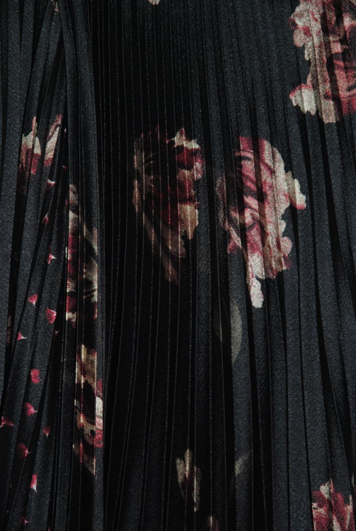 This Vince black pleated skirt blends timeless elegance with a touch of romance. The soft pleats create graceful movement, while the oversized burgundy floral prints with scattered pink petals add a feminine flourish. Designed with a smooth waistband and subtle side zip closure, it pairs effortlessly with blouses, knits, or tailored blazers for a versatile wardrobe staple.