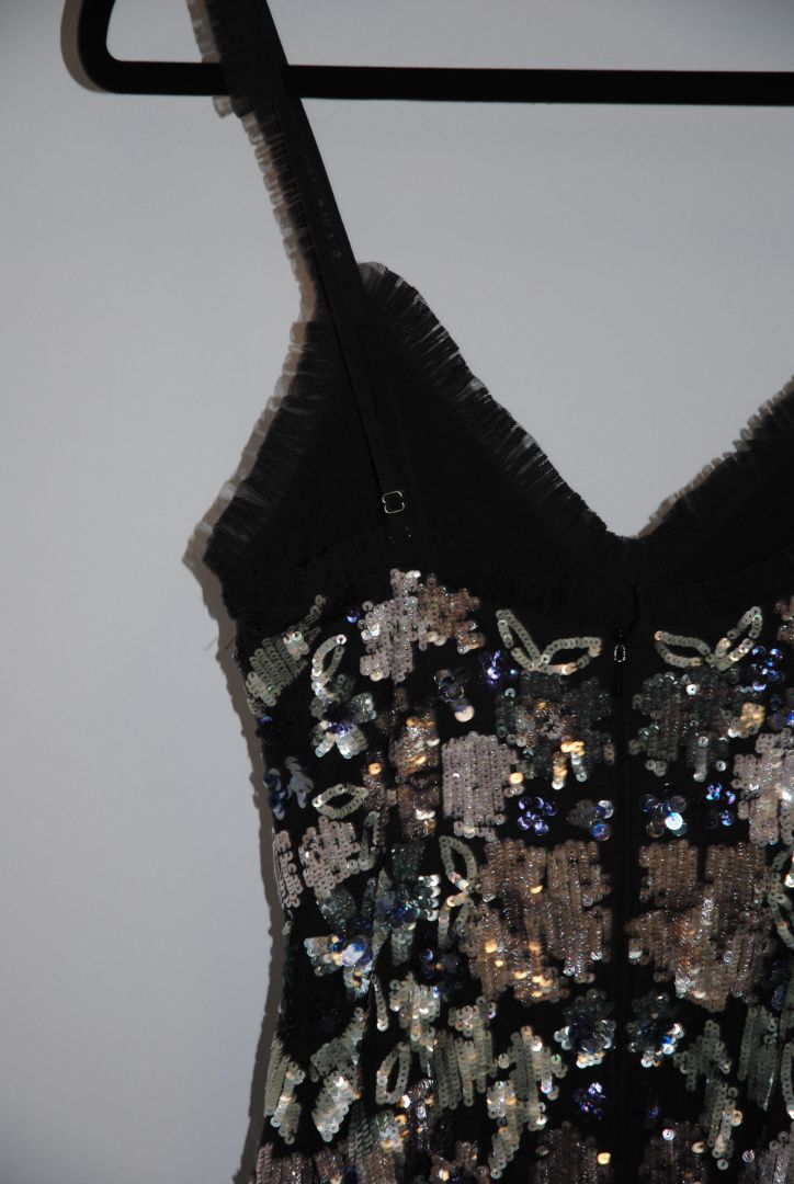 - Style guess (from photos): Black floral sequin-embroidered spaghetti-strap midi/ballerina length dress.