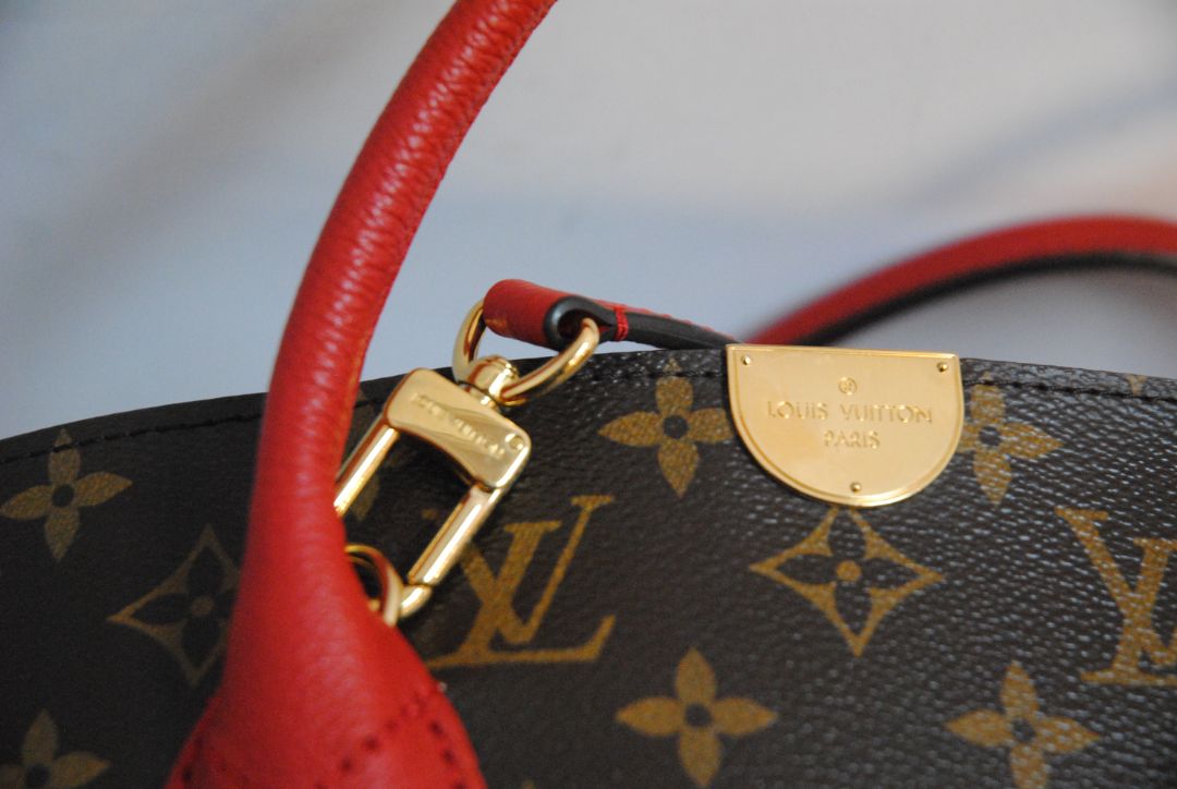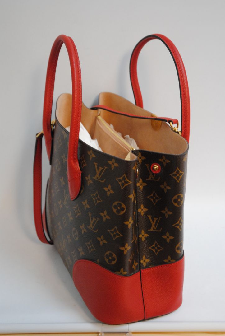 Louis Vuitton, LV Locky Tote, Monogram Canvas, Red Leather, Designer Tote, Luxury Bag, Top Handle Tote, LV Handbag