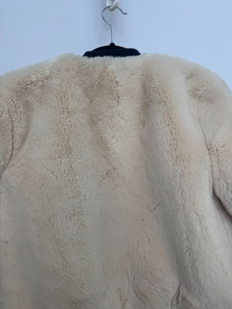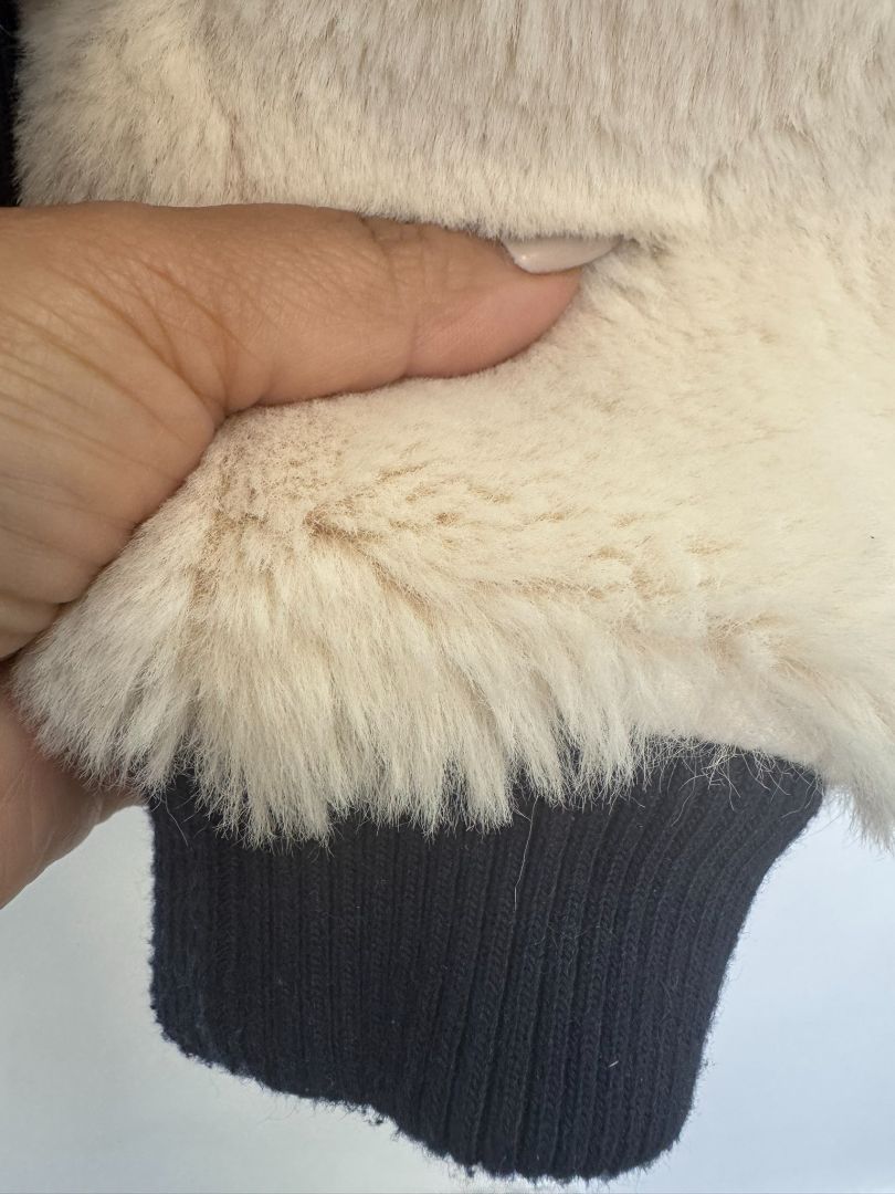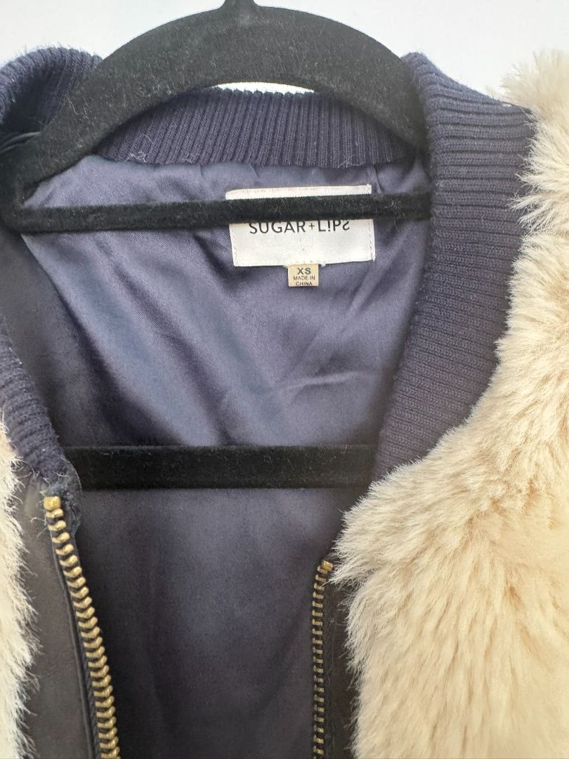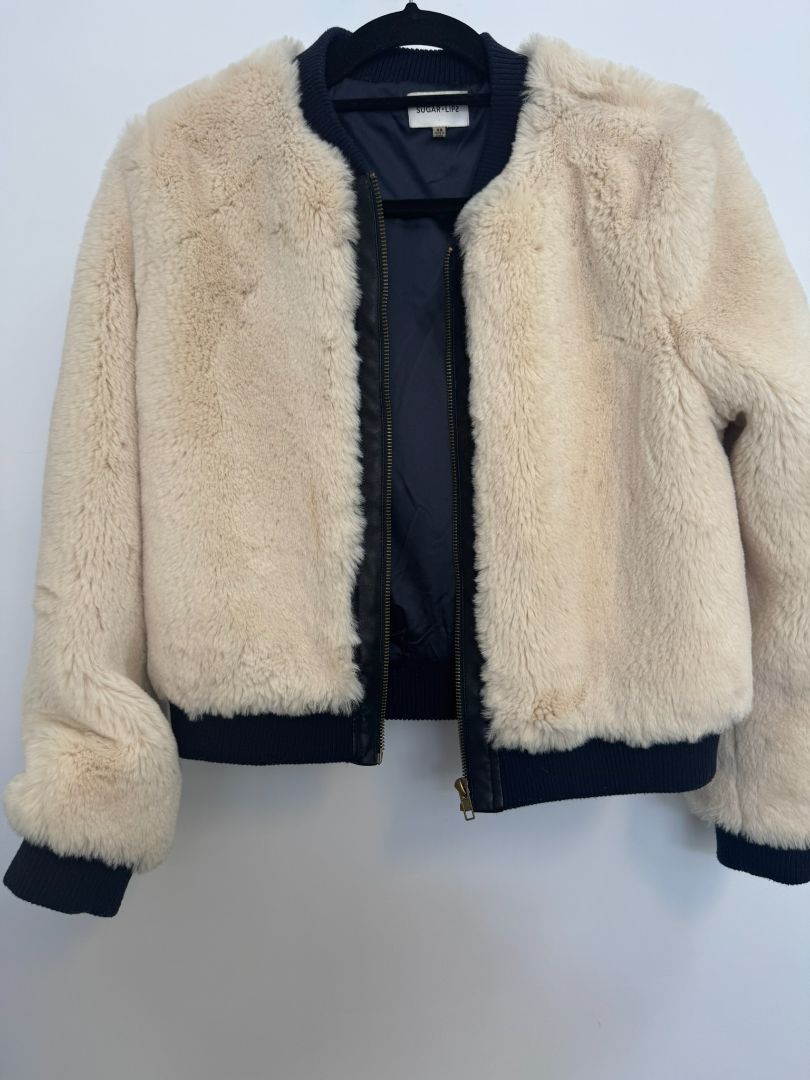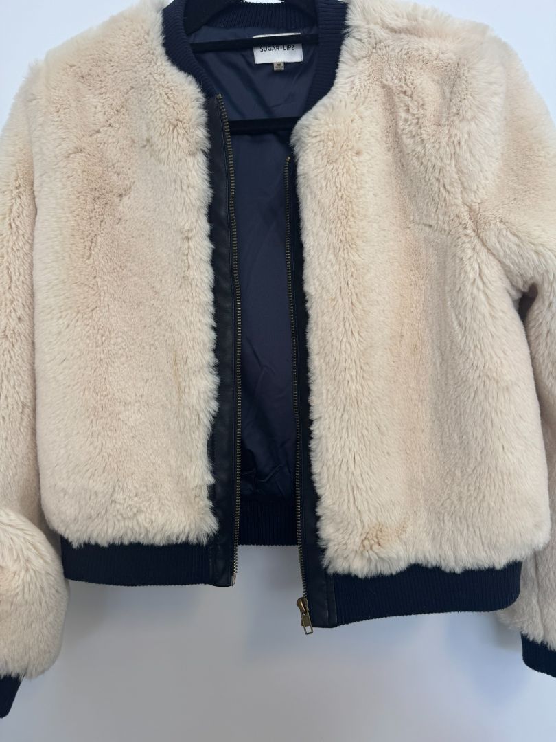 This cozy faux sherpa bomber jacket is fully lined, featuring a full zip front and elasticized pleather hem and cuff. With long sleeves, it offers an easy, boxy silhouette.